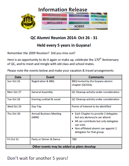 The dates for the 170th QC celebrations and ICQC ABM has now been confirmed as Oct 26-31, 2014